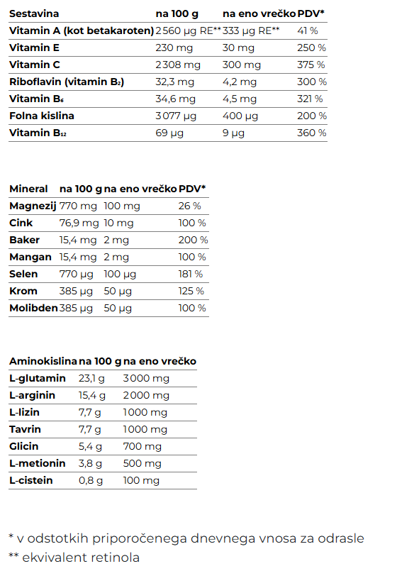 Od klasičnega izdelka Aminogran Immun se razlikuje po uporabi naravnega sladila iz stevie (steviol glikozidi).