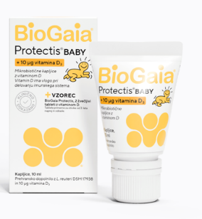 BioGaia Protectis baby mikrobiotične kapljice z vitaminom D3 vsebujejo L. reuteri Protectis, edinstveno in patentirano mlečnokislinsko bakterijo, ki se je med evolucijo prilagodila na življenje v človeškem organizmu. Dodan imajo vitamin D3, ki je potreben za normalno rast in razvoj kosti in prispeva k delovanju imunskega sistema. Primerne so za vašega dojenčka takoj po rojstvu.