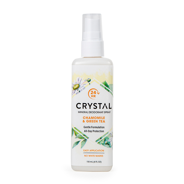 Crystal DeodorantTM KAMILICA in ZELENI ČAJ, vsebuje naravne mineralne soli ter navdaja z vabljivo naravno aromo kamilice in zelenega čaja. Preprečuje nastanek neprijetnega vonja, ki ga povzročijo bakterije pri razgradnji potu na površini kože. Prijetno osveži in ne preobremeni čutil.