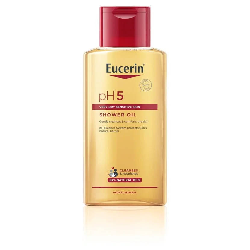 Eucerin pH5 olje za prhanje vsebuje kar 53 % naravnih negovalnih olj in dekspantenol, zato nežno očisti kožo ter jo hkrati zaščiti pred izsuševanjem. Njegova formula se ob stiku z vodo rahlo speni in poskrbi za prijeten občutek na koži. Izdelek je primeren tudi za otroke od 3. leta starosti dalje.