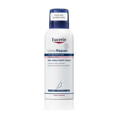 Eucerin UreaRepair PLUS 10 % pena za noge je namenjena intenzivni negi suhe in hrapave kože stopal ter nudi takojšnje olajšanje. Vsebuje učinkovito kombinacijo uree, naravnih vlažilnih faktorjev in ceramidov, ki kožo globinsko navlažijo, okrepijo njeno zaščitno bariero ter preprečujejo izgubo vlage. Delovanje dopolnjujeta dekspantenol in dekandiol, ki dodatno podpirata obnovo kože.