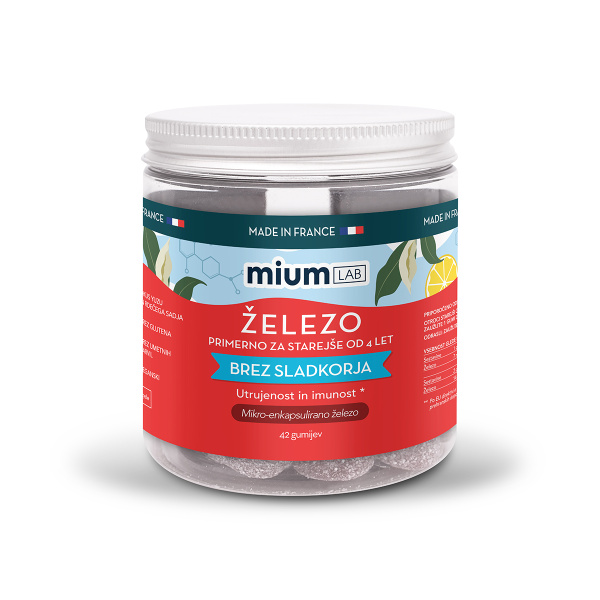 Prehransko dopolnilo z mikroenkapsuliranim železom, gumiji z okusom yuzu in rdečega sadja.