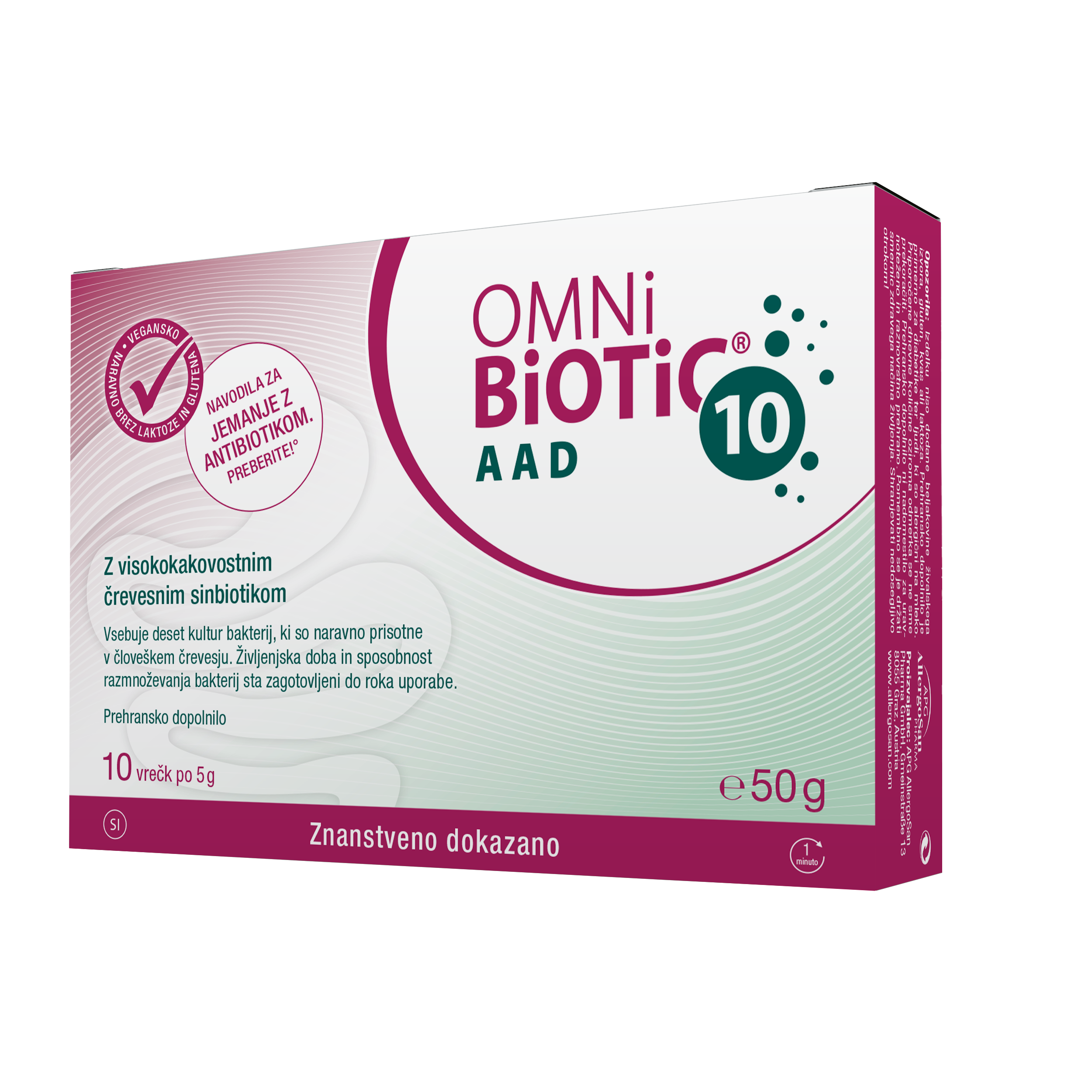 Navodila za uporabo: V času terapije z antibiotiki zaužijemo 2 x dnevno po 1 vrečko OMNi-BiOTiC® 10 AAD (= 5 g). Vsebino vrečke vmešajte v 125 ml vode, počakajte najmanj 1 minuto, da se sestavine aktivirajo, premešajte in nato popijte.