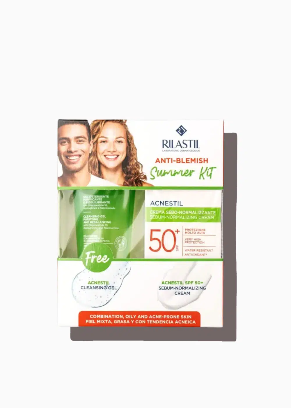 Rilastil Anti-blemish summer kit (Acnestil krema SPF50+40 ml in Acnestil čistilni gel 50 ml) je popolen duo za čiščenje in zaščito mešane in mastne, k aknam nagnjene kože. Vsebuje nežen čistilni gel in kremo za zaščito pred soncem z aktivnimi sestavinami. Skupaj delujeta proti vsem 4 fiziološkim vzrokom nastanka aken, kožo očistita, navlažita in zaščitita pred škodljivimi učinki UV sevanja.