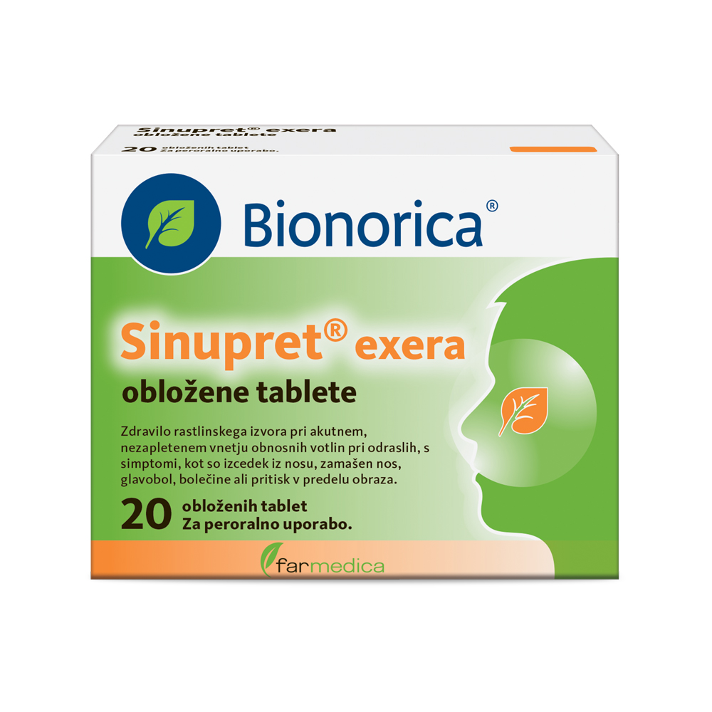 Sinupret exera je zdravilo rastlinskega izvora za zdravljenje akutnega nezapletenega vnetja obnosnih votlin pri odraslih. Izvlečki zdravilnih rastlin v zdravilu Sinupret exera zmanjšajo vnetje in oteklino sluznice nosu in obnosnih votlin ter razredčijo gosto zastajajočo sluz v obnosnih votlinah. Tako se ponovno vzpostavi dihanje na nos ter omogoči dobra drenaža sinusnih votlin in s tem izločanje sluzi. Zmanjša se občutek tiščanja v glavi in spremljajoči glavobol kmalu preneha. Zdravilo Sinupret exera pomaga pri regeneraciji sluznice. Uporabljate ga lahko kot samostojno zdravilo pri akutnem nahodu, ki ga spremlja občutek pritiska v predelu sinusnih votlin, ali kot spremljevalno zdravilo pri zdravljenju zgornjih dihalnih poti, tudi ko že jemljete antibiotike ali druga protivnetna zdravila.