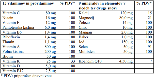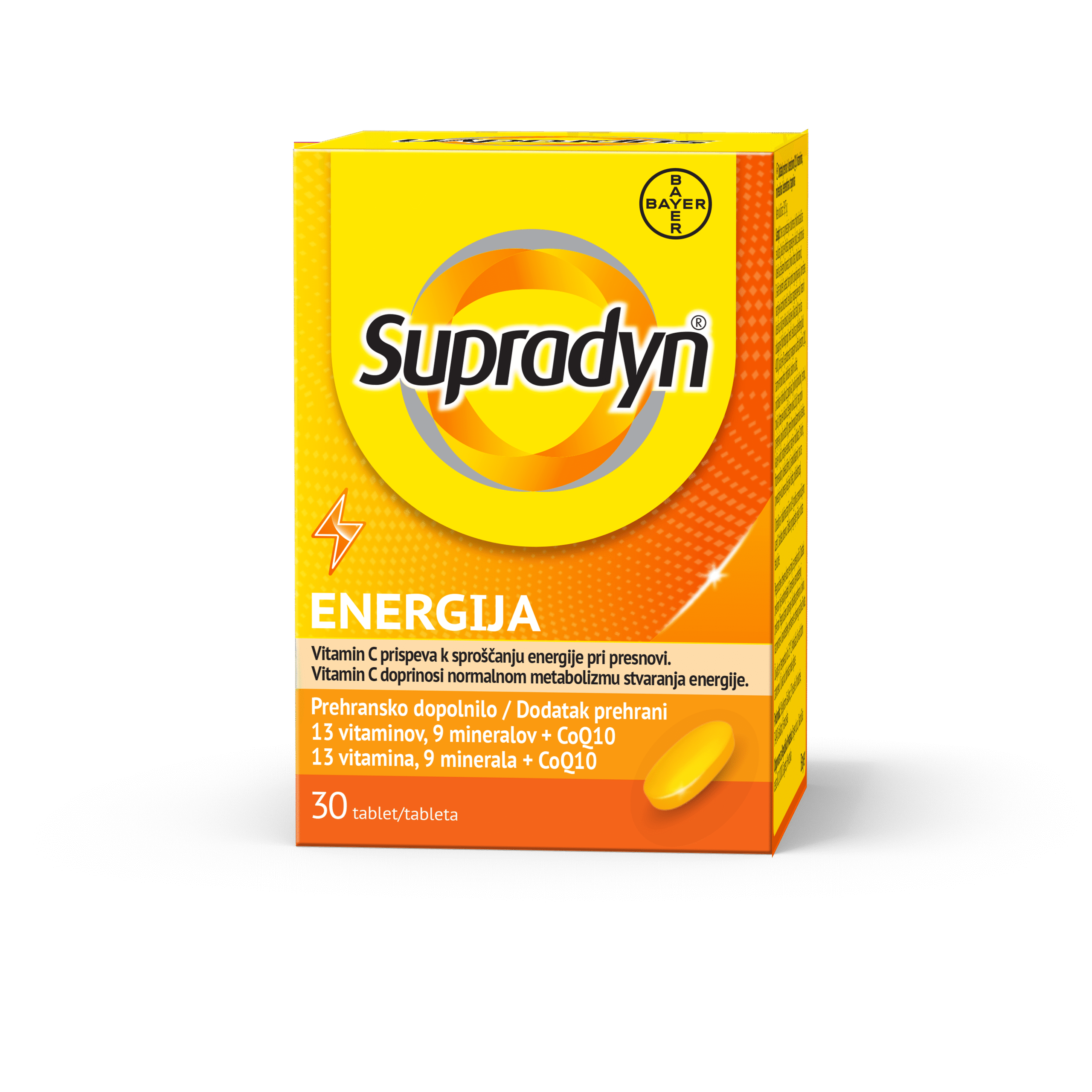 Supradyn® ENERGIJA filmsko obložene tablete so napredno prehransko dopolnilo z edinstveno kombinacijo 13 vitaminov, 9 mineralov in koencima Q10 (CoQ10), namenjeno podpori naravne presnove energije in zmanjšanju utrujenosti ter izčrpanosti.