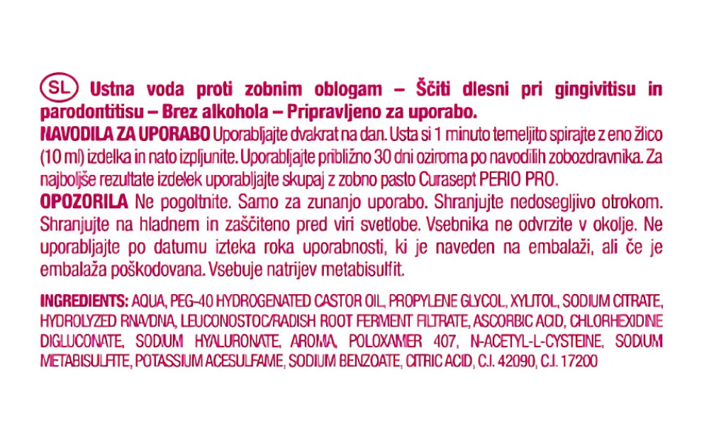 – 0,12 % klorheksidina (CHX) ki s svojim antiseptičnim delovanjem ter obstojnostjo na površini trdih in mehkih tkiv zagotavlja podaljšano kontrolo nastajanja zobnih oblog.