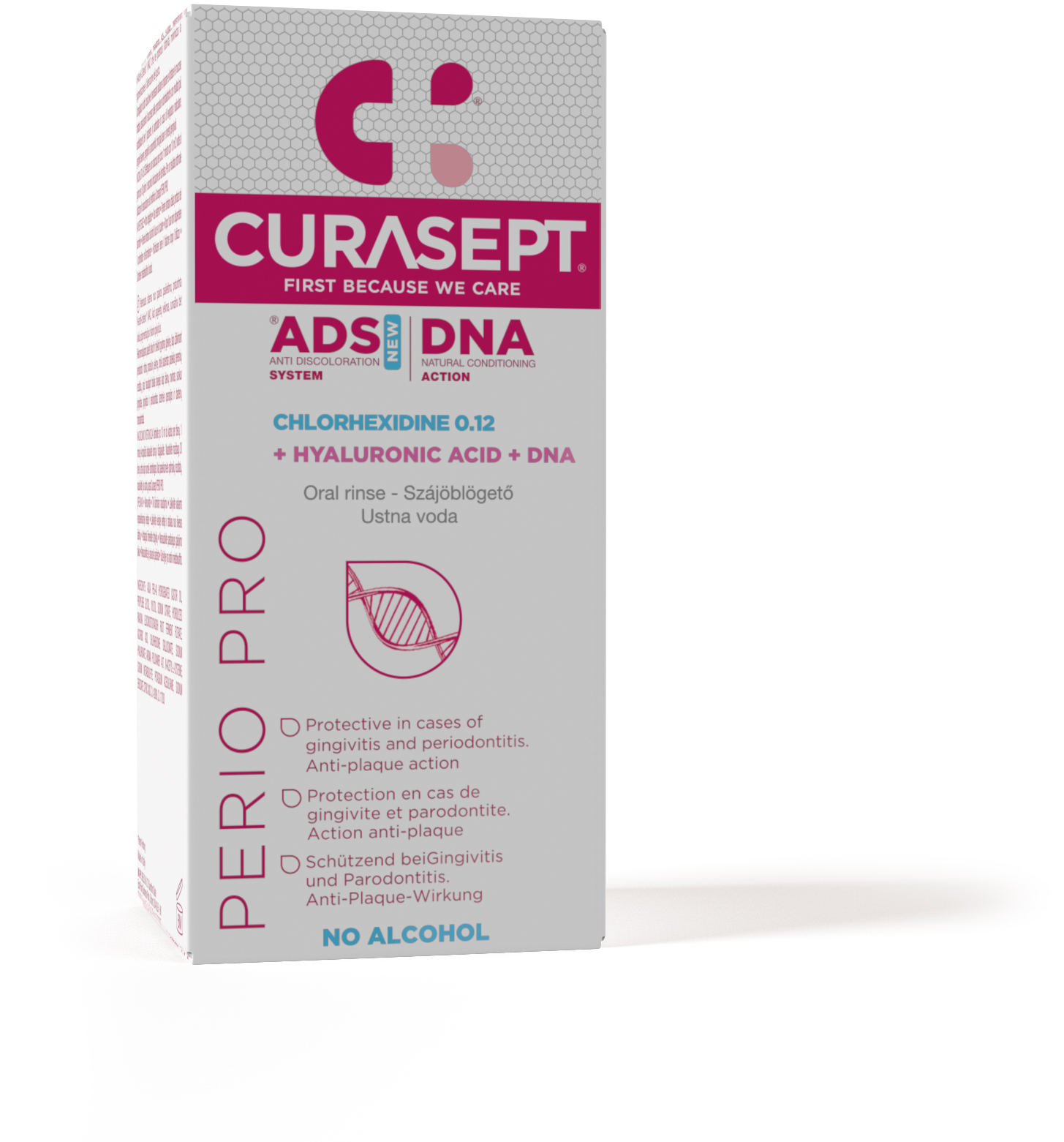 Ustna voda Curasept ADS | DNA PERIO PRO s svojo sestavo omogoča učinkovito obvladovanje nastajanja zobnih oblog ter pospešuje celjenje prizadetega tkiva in obnovo dlesni.