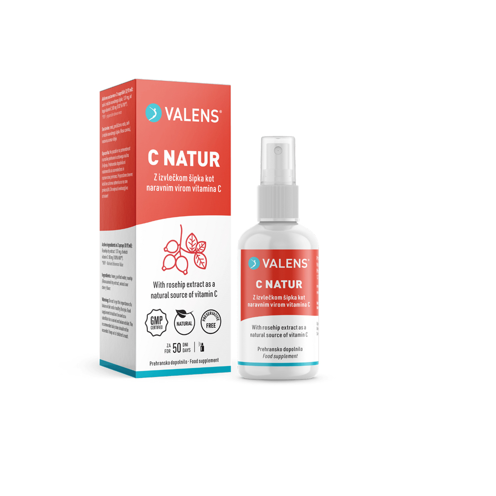 Valens C natur je naravno prehransko dopolnilo z izvlečkom šipka kot naravnega vira vitamina C, ki ima vlogo pri delovanju imunskega sistema, zmanjševanju utrujenosti in izčrpanosti ter pri zaščiti celic pred oksidativnim stresom. Oblika ustnega pršila v gelu omogoča hitro absorpcijo, ki se začne že v ustni votlini. Izdelek je še posebej priročen za vse, ki imajo težave z absorpcijo v prebavilih, predstavlja pa tudi okusno alternativo kapsulam in tabletam. Naravna formula ne vsebuje konzervansov, zato je izdelek primeren tudi za otroke do 1. leta starosti. Kombinacija medu, šipka in naravne arome višnje daje izdelku odličen okus.