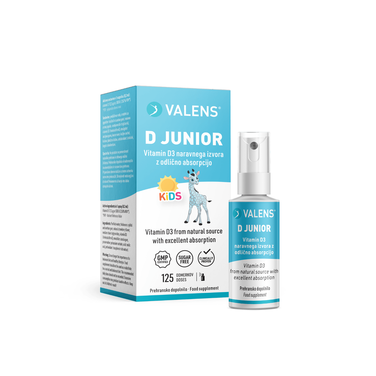 Valens D Junior je inovativno in klinično dokazano učinkovito ustno pršilo za otroke od 3. leta starosti. V enem razpršku vsebuje 500 IU naravnega vitamina D3 in ima odličen okus jagode, ki ga otroci obožujejo. Oblika pršila omogoča dobro absorpcijo in zabavno odmerjanje ter predstavlja priročnejšo alternativo kapsulam, tabletam in kapljicam.
