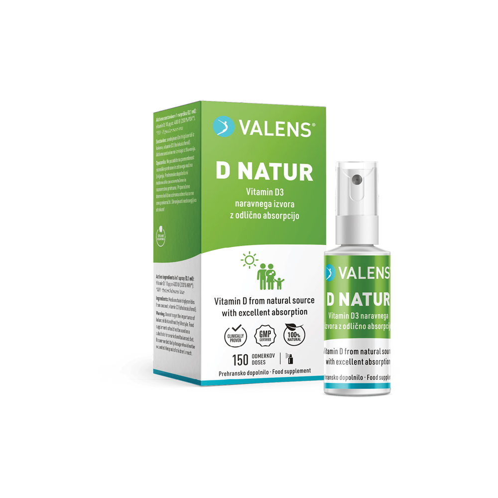Valens D Natur je inovativno, klinično dokazano učinkovito ustno pršilo z vitaminom D3 za dojenčke, otroke in odrasle. Njegova oblika omogoča odlično absorpcijo ter enostavno, zabavno in natančno odmerjanje. Izdelek je naraven in ne vsebuje konzervansov ali sestavin, ki bi povzročale kolike oziroma krče. Vitamin D prispeva k ohranjanju zdravih kosti in zob, vlogo pa ima tudi pri delovanju mišic in imunskega sistema. Zadosten vnos vitamina D je še posebej pomemben v zgodnjem otroštvu in v obdobjih pospešene rasti.