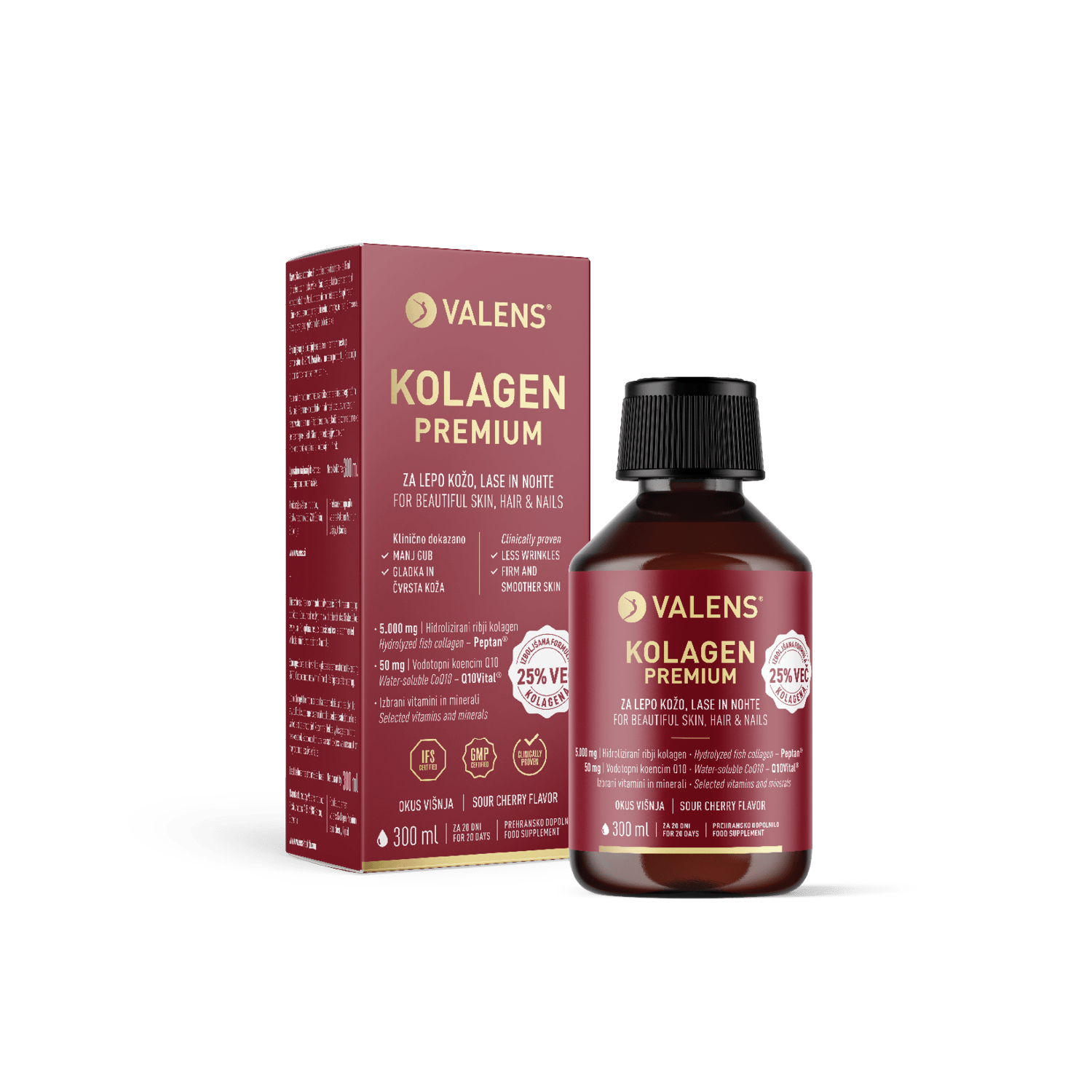 Valens Kolagen Premium ponuja bogat kompleks sestavin s klinično dokazanim učinkom na kožo. Vsebuje hidrolizirani ribji kolagen Peptan®, ki sodi med vodilne znamke kolagena v svetu, Q10Vital®, v Sloveniji razvito vodotopno obliko koencima Q10, ter izbrane vitamine in minerale.