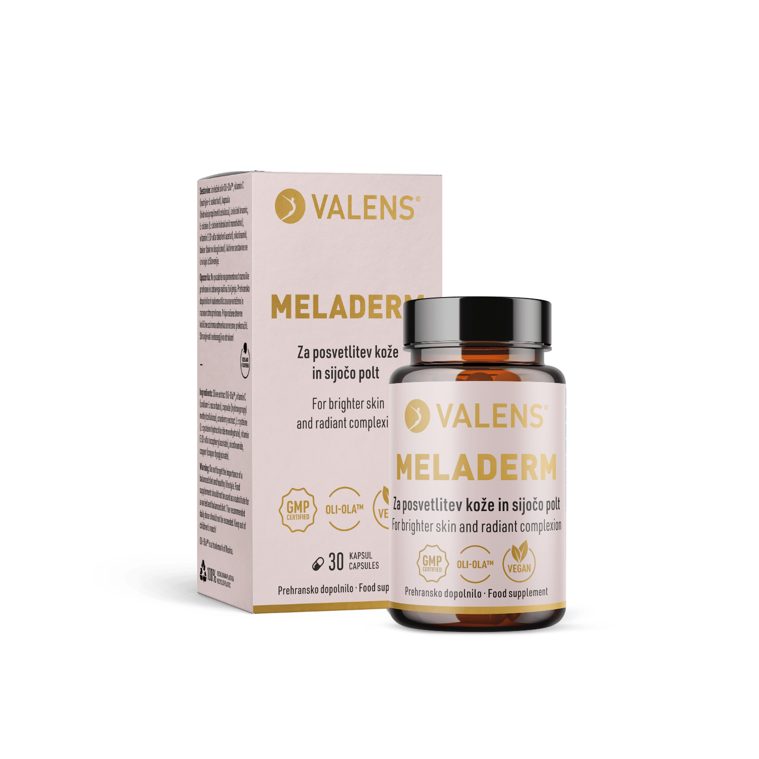 Valens MelaDerm je inovativna formula za normalno pigmentacijo kože in sijočo polt. Kapsule vsebujejo standardizirani izvleček oliv Oli-Ola™, ki pomaga zmanjšati prezgodnje znake staranja in spodbuja videz bolj napete kože, uporablja pa se tudi za posvetlitev kože. Dodani so mu niacin, vitamina C in E, ter baker, ki prispeva k normalni obarvanosti kože.