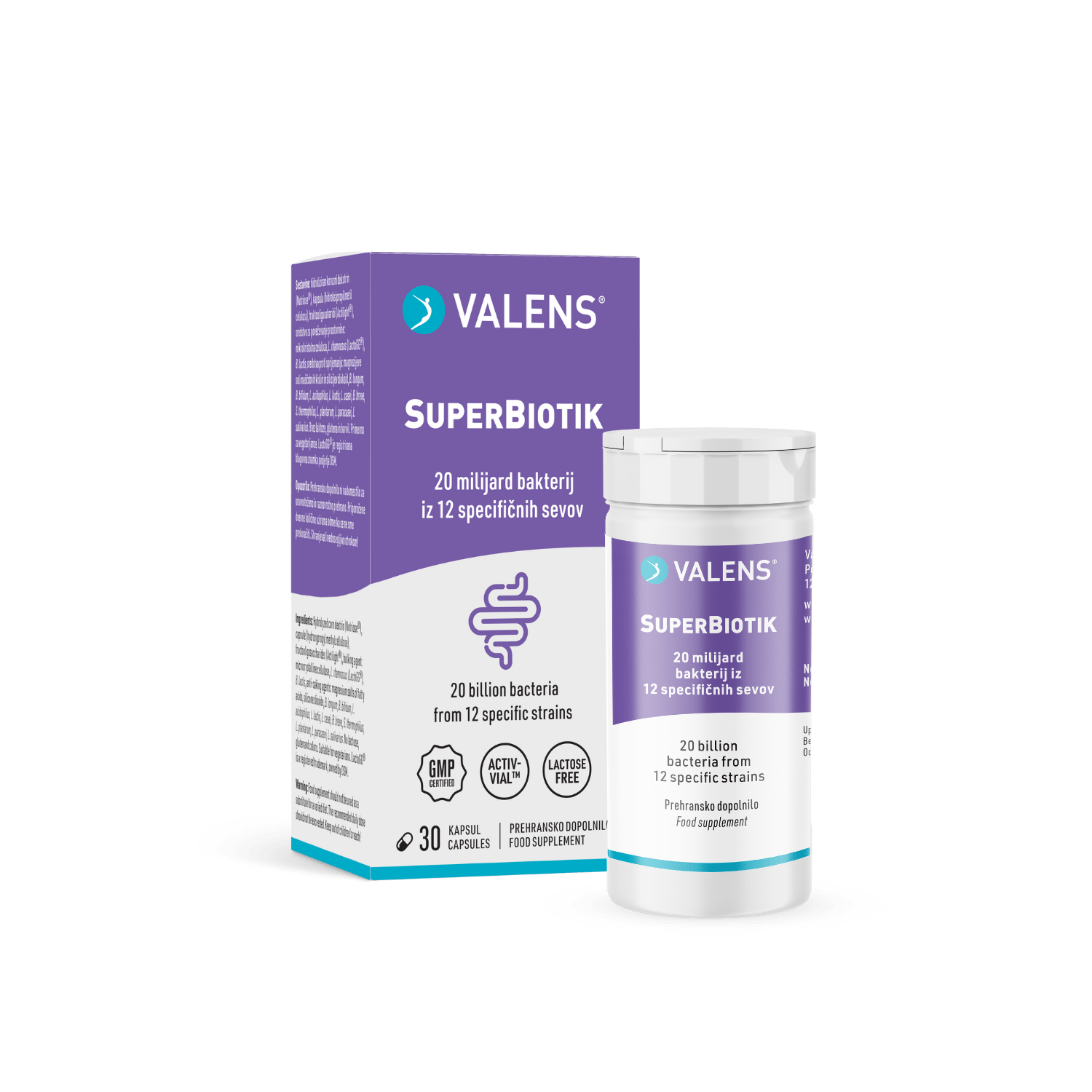 Valens SuperBiotik v eni kapsuli vsebuje kar 20 milijard živih bakterij iz 12 specifičnih sevov, tudi LactoGG®, obliko enega od najbolj preučenih sevov (L. rhamnosus GG). Obogaten je z vlakninami, ki spodbujajo rast in aktivnost koristnih bakterij. Kulture so odporne na nizek pH želodca, zato lahko kapsule tudi odpremo in njihovo vsebino vmešamo v vodo ali napitek. Patentirana zaščitna viala Activ-Vial™ dokazano zmanjšuje vsebnost vlage ter podaljša obstojnost izdelka.