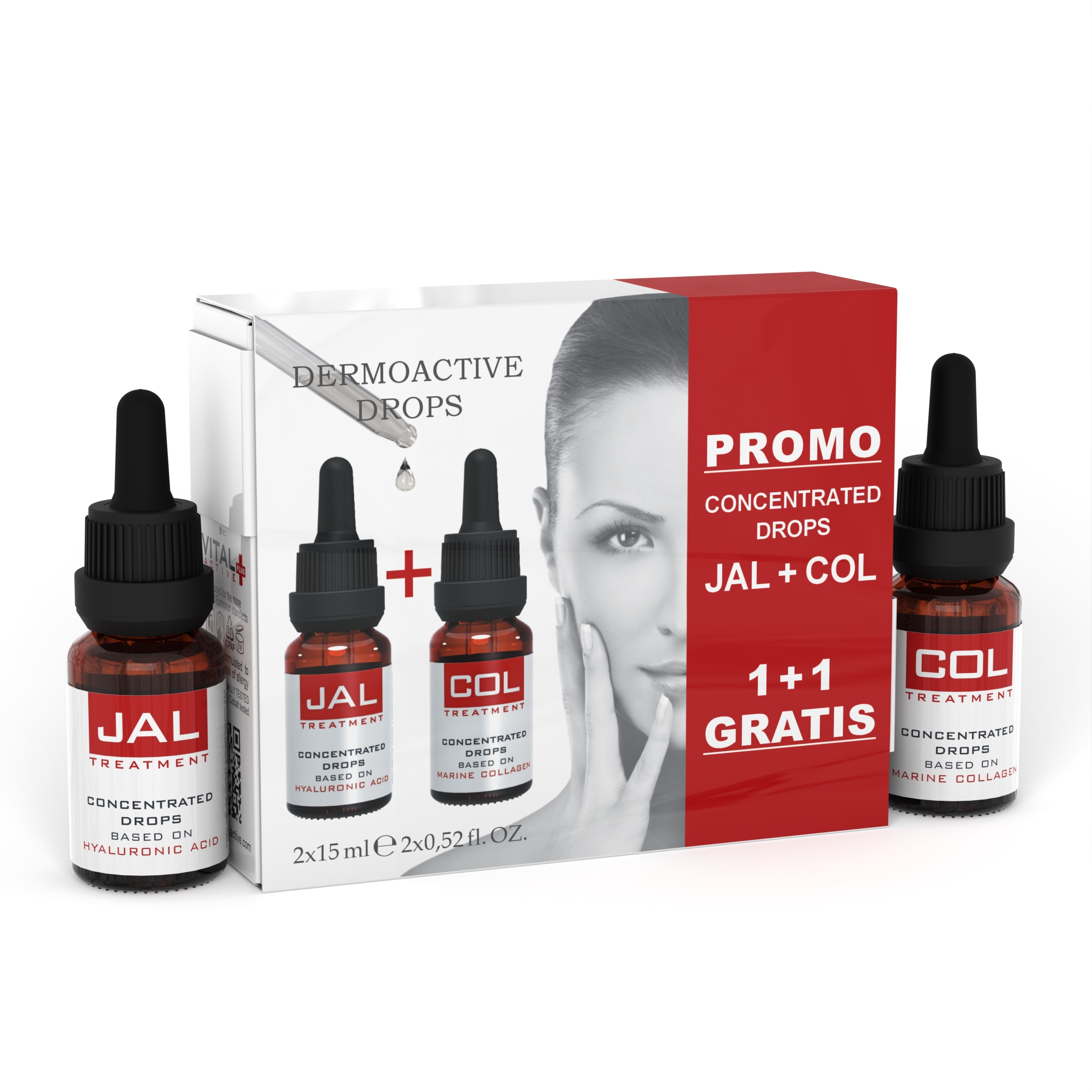 Vital Plus Active JAL in COL kapljice sta tretmaja za obraz, zasnovana za intenzivno vlaženje, zaščito in pomirjanje kože. Obe formuli temeljita na visoki vsebnosti humektantov ter kolagena, ki pomagata ohranjati zdravo in prožno kožo, obenem pa zmanjšujeta občutljivost in suhost epidermisa.