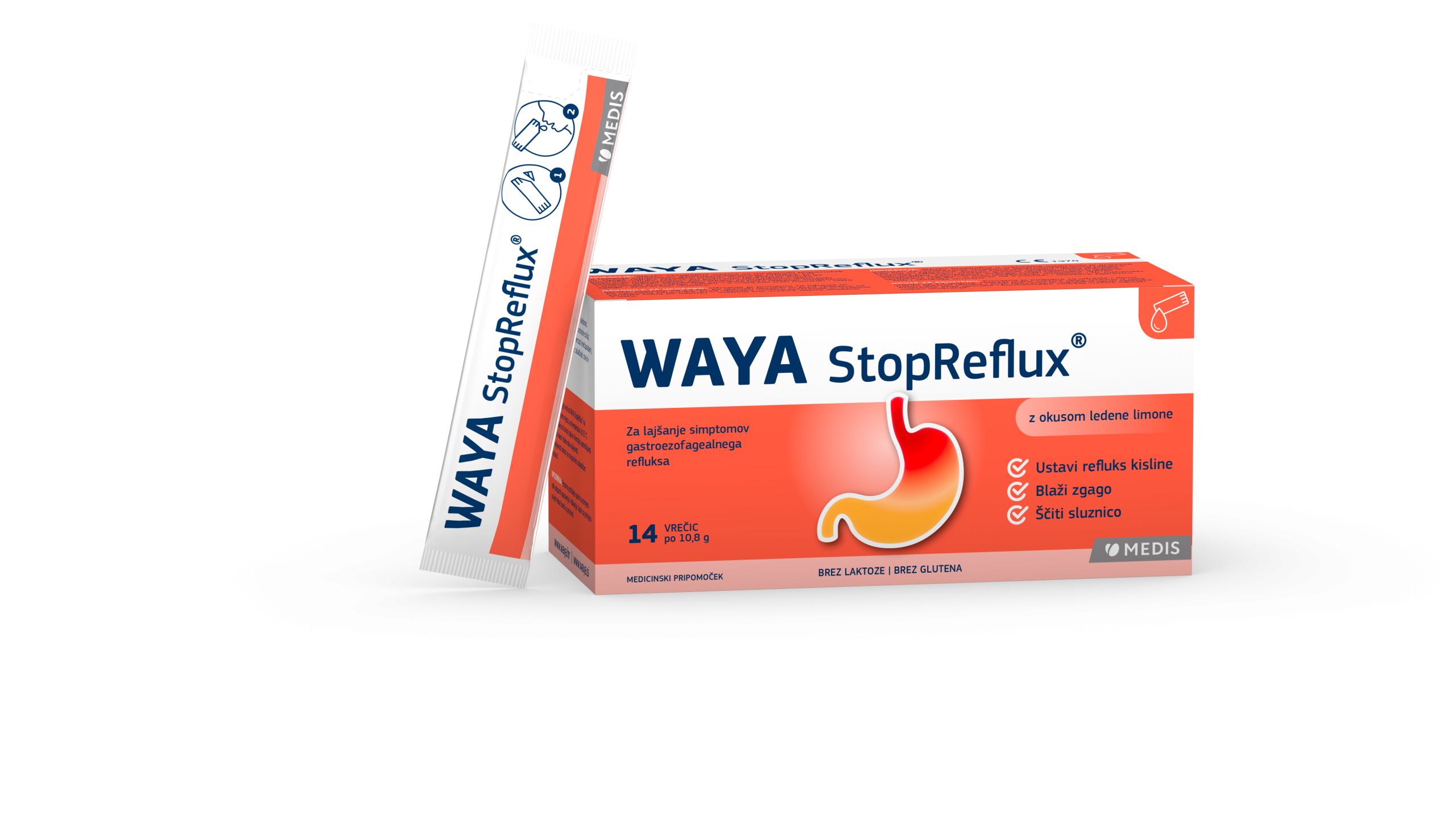 WAYA StopReflux® vrečice (tekoča peroralna suspenzija) so medicinski pripomoček za lajšanje simptomov gastroezofagealnega refluksa, kot so: zgaga, zgaga med nosečnostjo, refluks želodčne kisline, vnetje požiralnika, ki ga povzroča refluks, težave pri požiranju in boleče požiranje. Zahvaljujoč sinergijskemu delovanju sestavin mehansko preprečuje refluks v manj kot treh minutah, lajša zgago ter ščiti in celi sluznico (učinek hialuronske kisline in hondroitin sulfata).